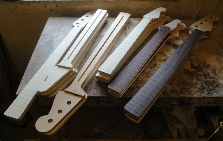 The above picture shows numerous necks/neck blanks at various stages of completion, I offer all types from one piece with walnut skunk strip to slab board...and even the later ‘veneer’ type board, either rosewood or maple cap.