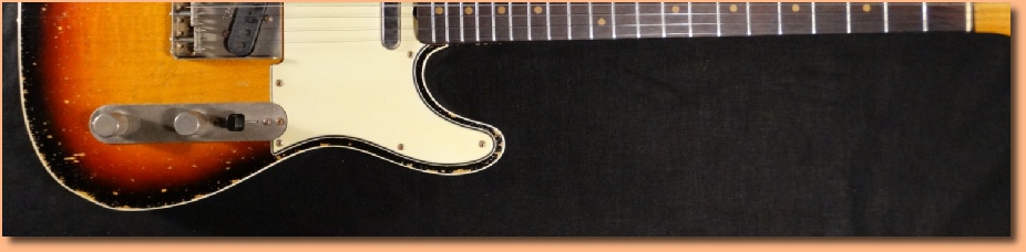 1963 style T type guitar, finished in a lightly distressed three tone sunburst. Alder body, maple neck with curved join rosewood fingerboard.