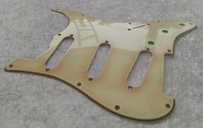 The pickguard above on the left is a genuine 1962 example (note 2 extra switch holes drilled next to selector switch slot), the pickguard on the right is a Bravewood repro. These are hand made in the Bravewood workshop using material that closely matches the original in colour and thickness, they are cut to vintage spec. including the edge bevel, which as the picture below demonstrates matches the original ‘62 perfectly...