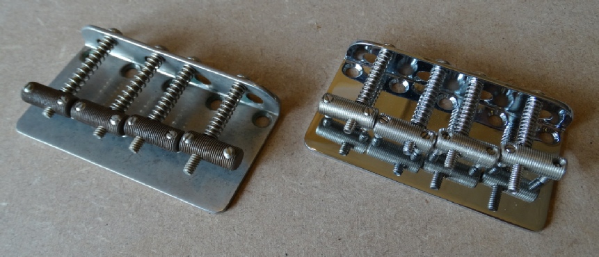 Here’s a couple of ‘58 style bass bridges (finer threading on the saddles than the later type), the one on the left has been through the Bravewood ageing process, the one on the right is fresh out of the packet...